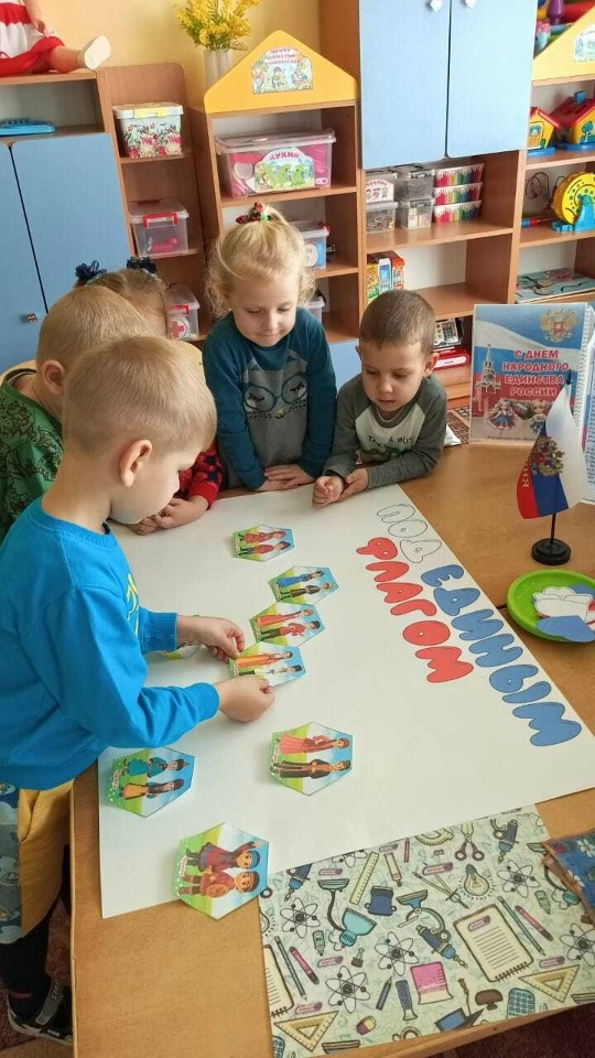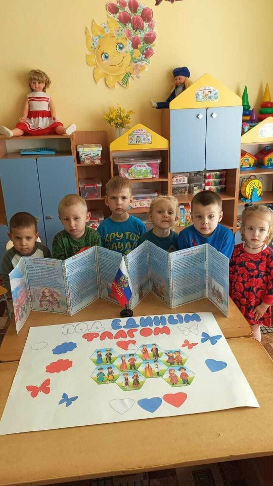 В преддверии праздника "Дня народного единства", в группе "Солнышко" (3-4 года) прошло тематическое занятие "Дружат дети всей страны". В доступной для ребят форме рассказали о празднике и его значении, рассмотрели иллюстрации народов нашей страны. Говорили о силе дружбы, доброты и единения. Итогом нашего занятия стал плакат "Под единым флагом", где ребята собрали "мозайку дружбы", символизирующую единение разных народов России.